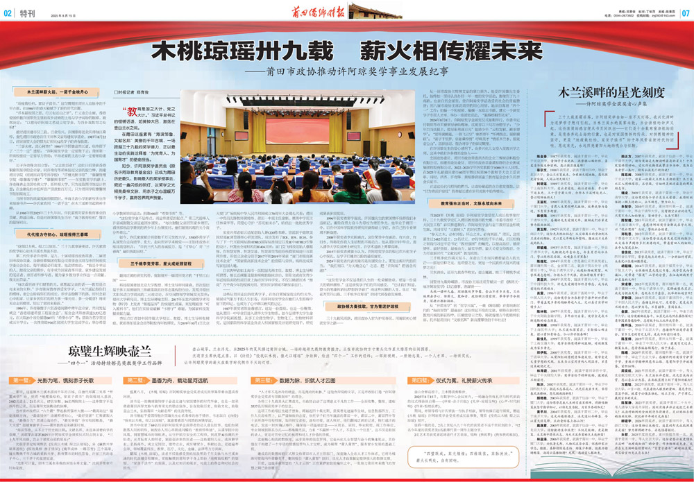 當2025年《木桃 瓊瑤》許阿瓊獎學金受獎人成長故事集付梓,三十九載獎學史匯入莆田教育強市的大潮。市委市政府“三大民生工程”首位推進教育,許阿瓊獎學金與壺蘭教育基金相映生輝,共同書寫“立德樹人”的時代答卷。 “參天之木,必有其根;懷山之水,必有其源。”莆田,這座誕生過2482名進士、21名狀元、17名宰相的千年古城,正以松柏之韌踐行使命,以最高站位、最濃情懷、最好資源、最強合力、最實舉措、最大關愛支持教育,全力打造新時代“文獻名邦”教育高地。 三千桃李化作滿天星斗,在壺山蘭水間閃耀著最動人的光芒——那是信仰之光,是希望之光,更是一個民族偉大復興的逐夢之光! 蘭水泱泱,證卅九載春華秋實;壺山巍巍,映三千樹桃李成林。 回望卅九載崢嶸路,市政協主席沈萌芽賦詞一首《鷓鴣天·詠許阿瓊獎學》以記盛事、寄深情—— 木桃一諾卅九春。瓊瑤報處歲華馨。壺山不老鄉關意,蘭水映照赤子心。傳薪火,聚和音。政協傾注情愈深。莘莘學子今朝秀,深耕興邦松柏林。 從“開莆來學”到“獎學興城”,一曲《瓊瑤報》正奏響新時代的“海濱鄒魯”最強音!這份綿延不絕的文脈,更將在新時代教育興城的新征程中,以破壁穿云之勢,鑄就連綴古今的精神長廊,托舉起莆田向“文獻名邦”新高度攀登的千年壯志!